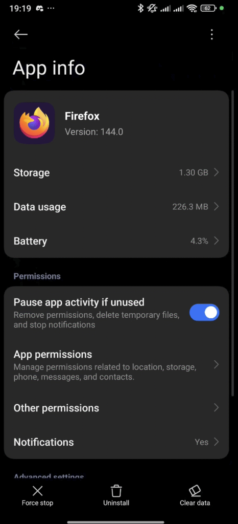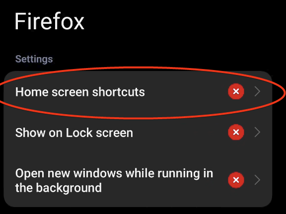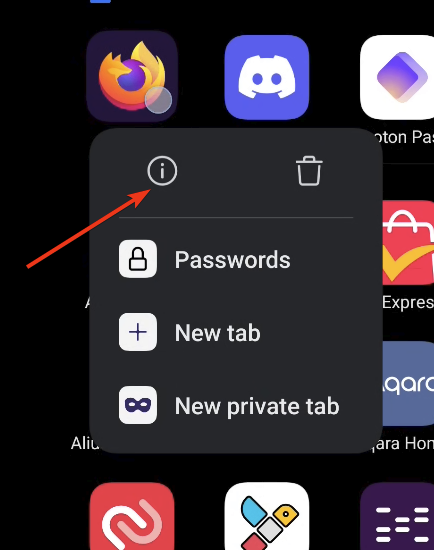 Hold inne lenge på ikonet for nettleseren(i dette tilfellet firefox) til denne menyen kommer opp. Klikk så på informasjonsikonet: