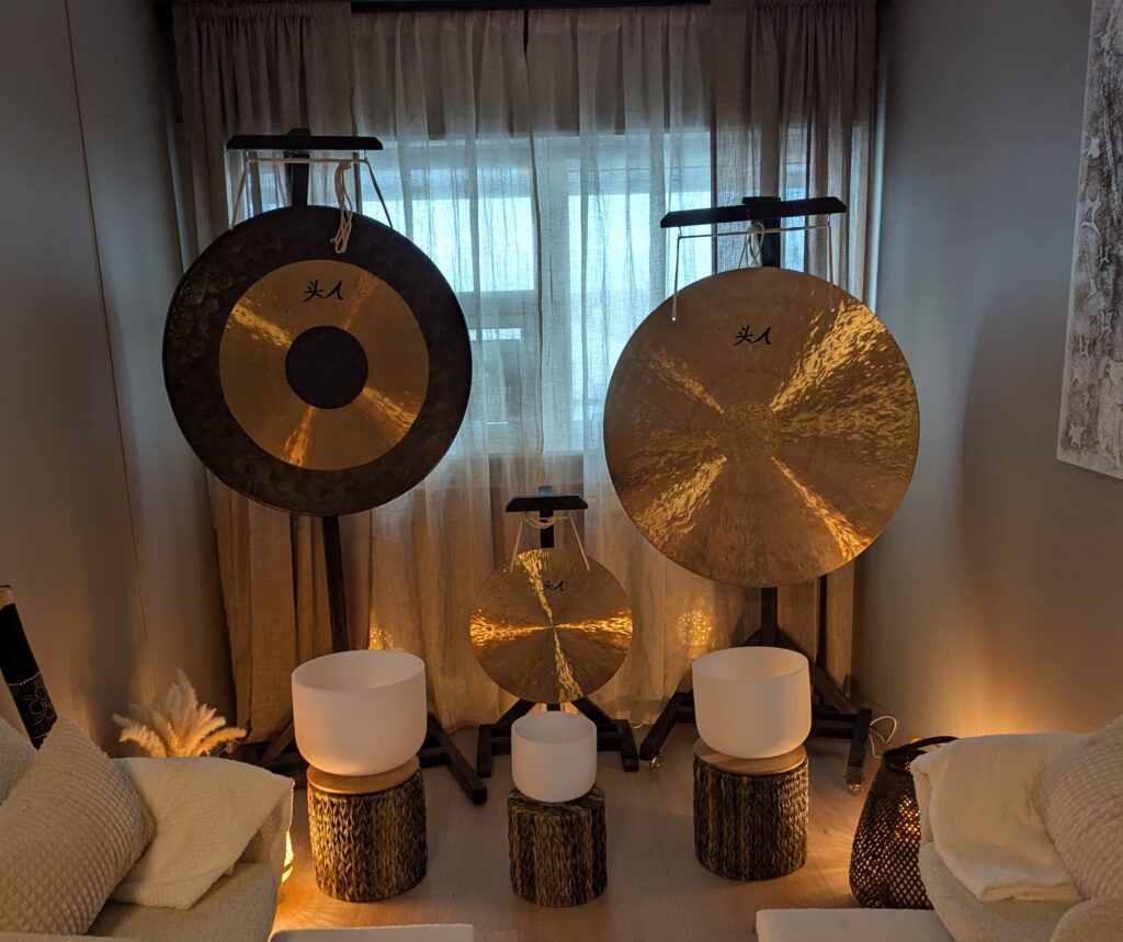 Under lydbadet benyttes bl.a. gong, ulike syngeboller, tromme mm.